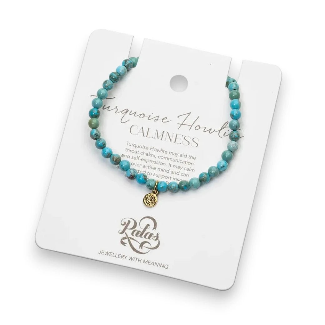 Experience the healing energy of the Turquoise Howlite Gem Bracelet. Turquoise Howlite may aid the throat chakra, communication and self-expression. It may calm an over-active mind and can also be used to support insomnia and enhance meditation. The brass lotus charm adds a touch of individuality and healing power to each piece.