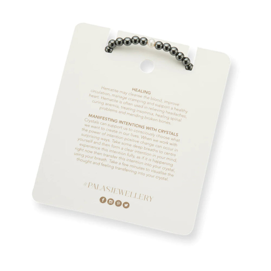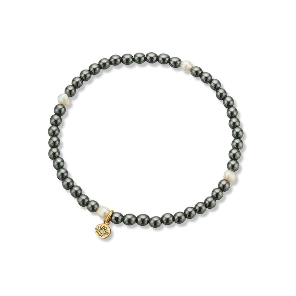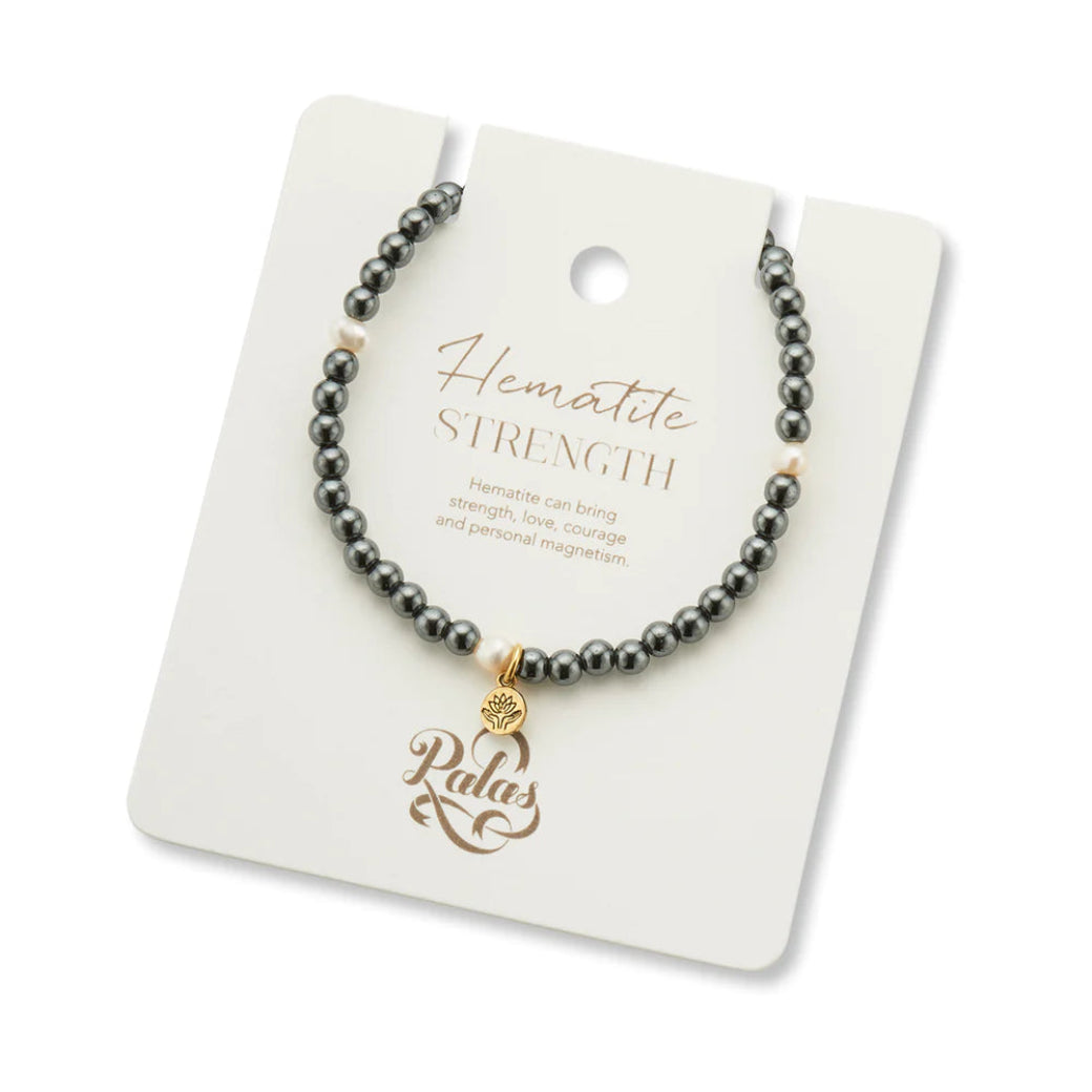 Delight in the symbolic power of the Hematite & Pearl Prosperity Gem Bracelet. The Strength bracelet combines two stones with complementary energies, designed to offer a balance between grounding protection and calming, emotional nurturing. This pairing is often used to bring harmony to the mind, body, and spirit, creating a protective shield while supporting emotional well-being. It's complemented by a healing brass lotus charm, making it a unique piece to treasure.