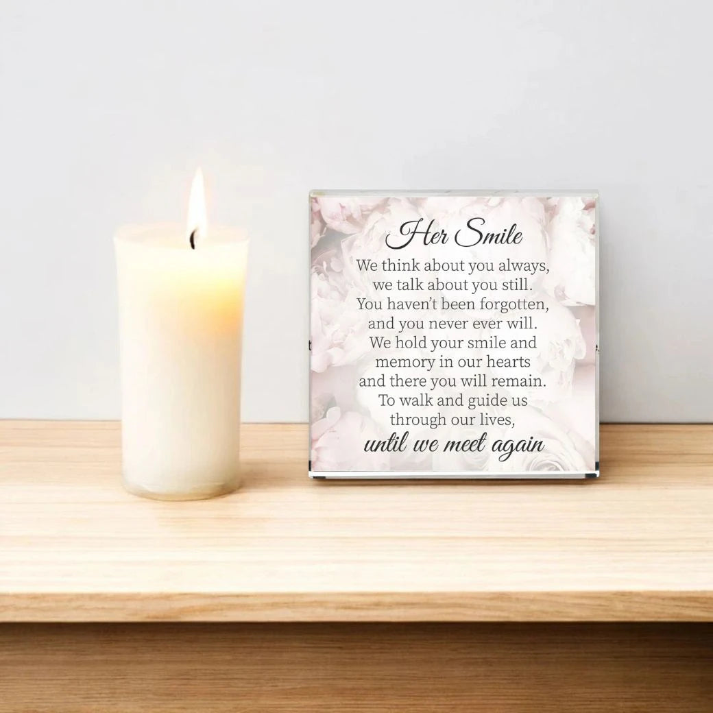 Celebrate a cherished memory with this Her Smile Crystal Block keepsake, a luminous tribute to a love that never fades. Etched with tender words, it offers comfort and peace, reminding you that her smile and spirit remain close, gently guiding you through each day. A timeless piece of remembrance that transforms grief into enduring love.